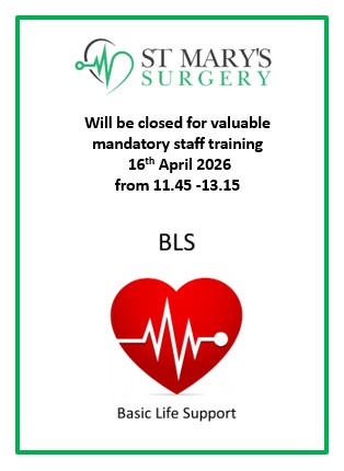 St Mary’s Surgery will be closed on Thursday 16th April 2026, from 11.45 to 13.15. For valuable mandatory staff training.
