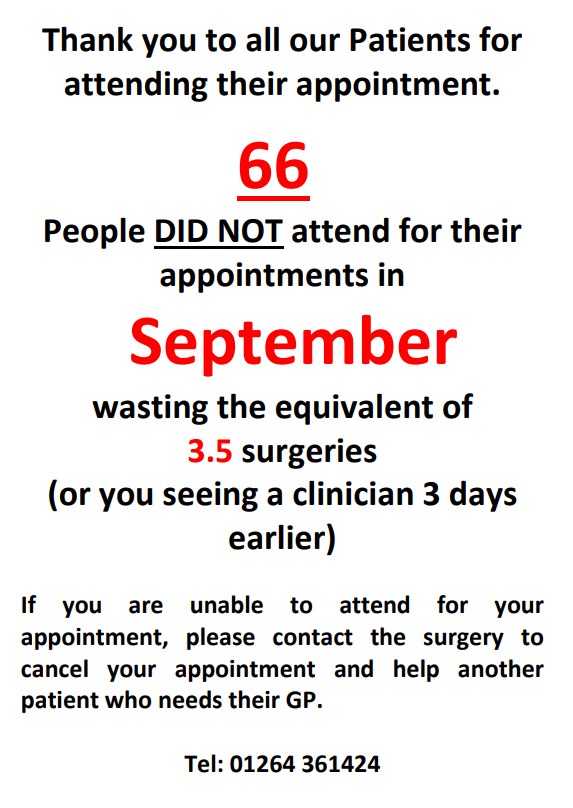 Unfortunately DNA appointments went up in September. Please cancel your appointment if you no longer require, to see a GP or Nurse.