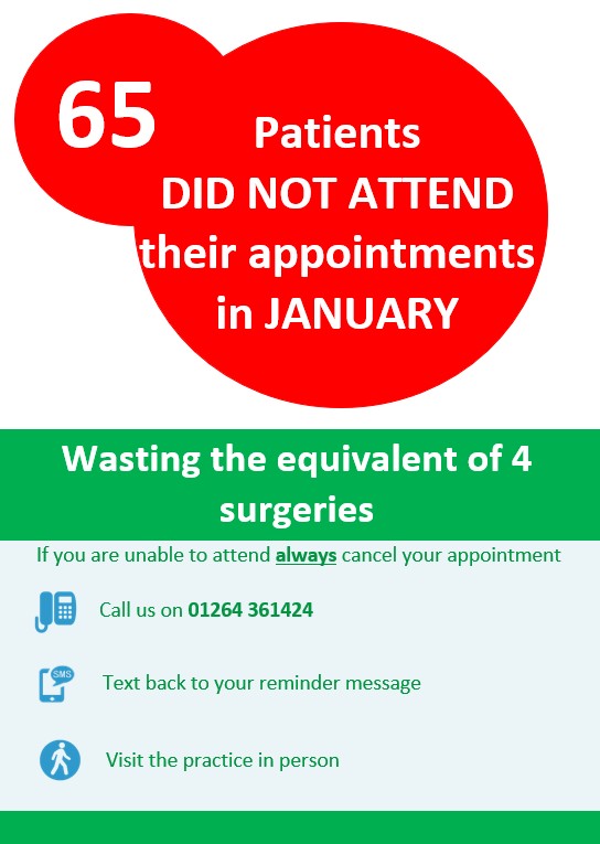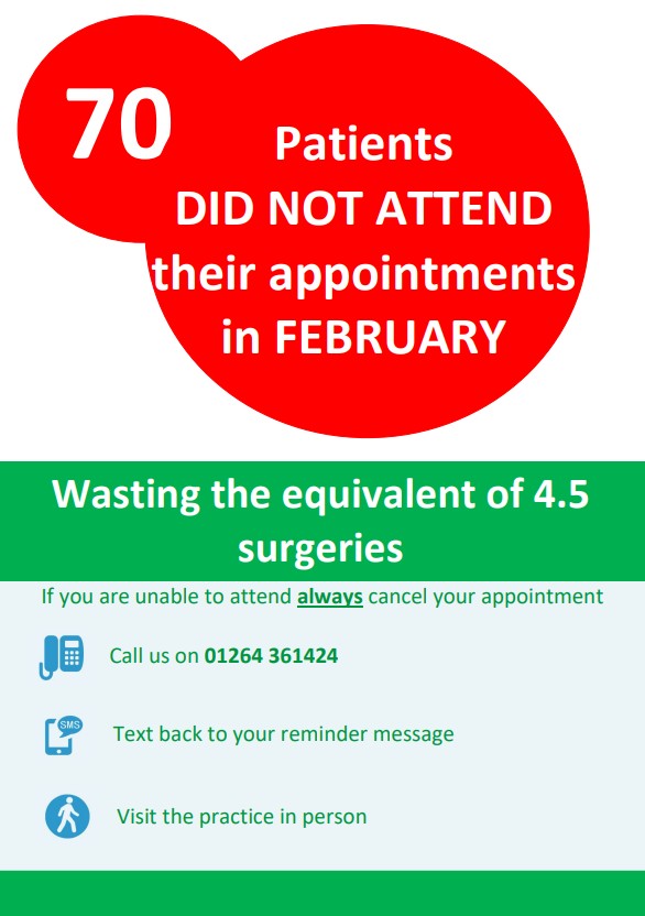 There are several convenient ways to cancel your appointment, phoning the surgery on 01264 361424, cancelling online via the NHS App, or by replying CANCEL to your reminder SMS.