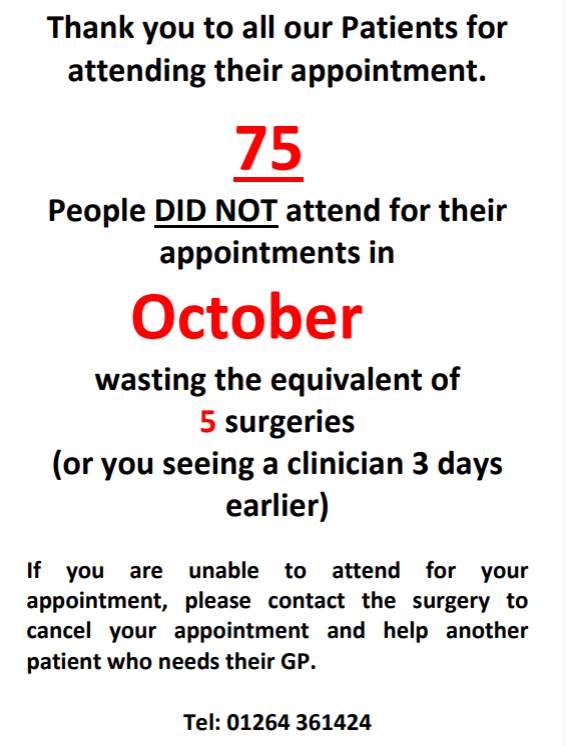 There are several convenient ways to cancel your appointment, phoning the surgery on 01264 361424, cancelling online via the NHS App, or by replying CANCEL to your reminder SMS.